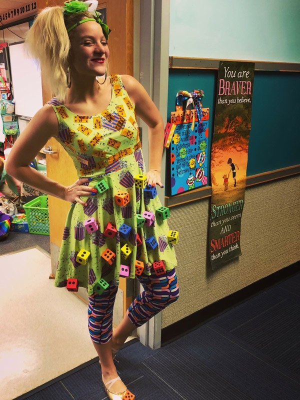 I have made more outfits than I can count but some examples would be dressing as a princess for learning about fantasy stories, or hot gluing books to my dress to learn about key details within a story, every color tutu imaginable for learning every color of the rainbow, dressing as the Cat in the Hat for Dr Seuss’s birthday week, a number line dress to learn numerical order, a dice dress with dominos on it to incorporate manipulatives into learning addition. The list goes on and on because I believe every outfit brings the lessons to life. It is my job to not only give the students knowledge but incorporate a way the students KEEP that knowledge. I believe the outfits help tremendously because they never stop talking about them. 😏