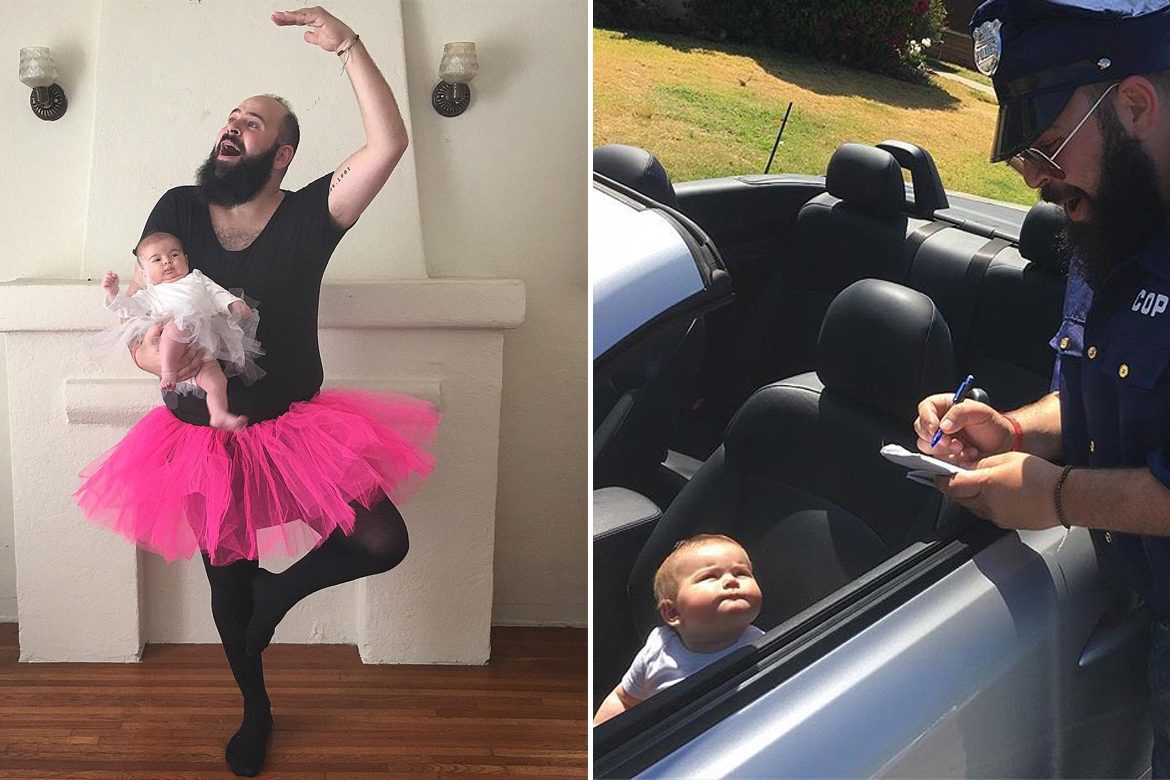 This California dad sets up these hilarious scenes, dressing up both himself and his 9-month-old daughter Zoe in funny costumes, and shares the photos taken by wife Carli on his Instagram page – @sbsolly. Wait until you see the garden gnome!